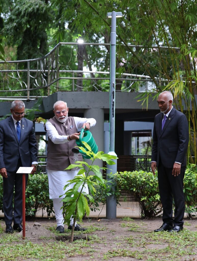 Marking a shared commitment to sustainability, the two leaders planted mango saplings under India’s “Ek Pedh Maa Ke Naam” campaign and Maldives’ “Pledge of 5 Million Tree Plantation” drive.