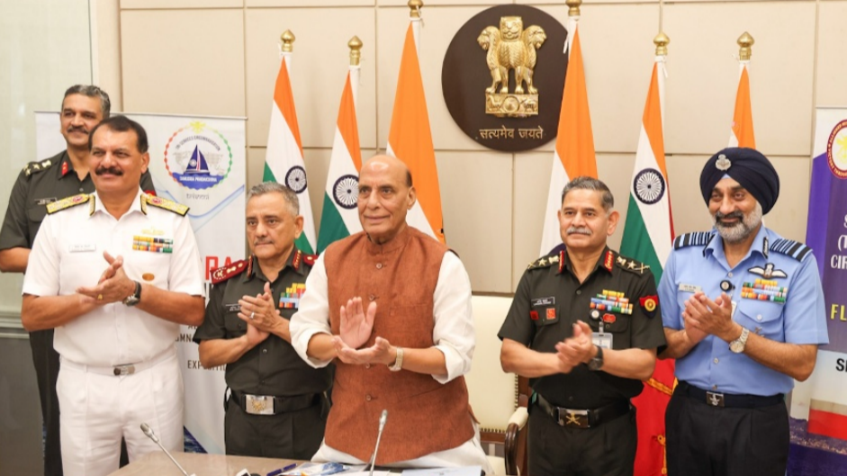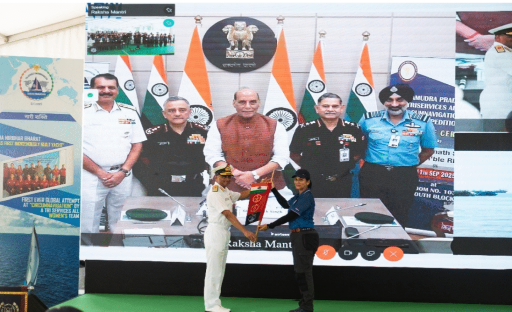 New Delhi, September 11, 2025 — Raksha Mantri (Defence Minister) Shri Rajnath Singh virtually flagged off the historic Tri-Service All-Women Circumnavigation Sailing Expedition ‘Samudra Pradakshina’ from the Gateway of India, Mumbai. This is the first such expedition in the world, undertaken by 10 women officers of the Indian Army, Indian Navy, and Indian Air Force onboard the indigenous Indian Army Sailing Vessel (IASV) Triveni.