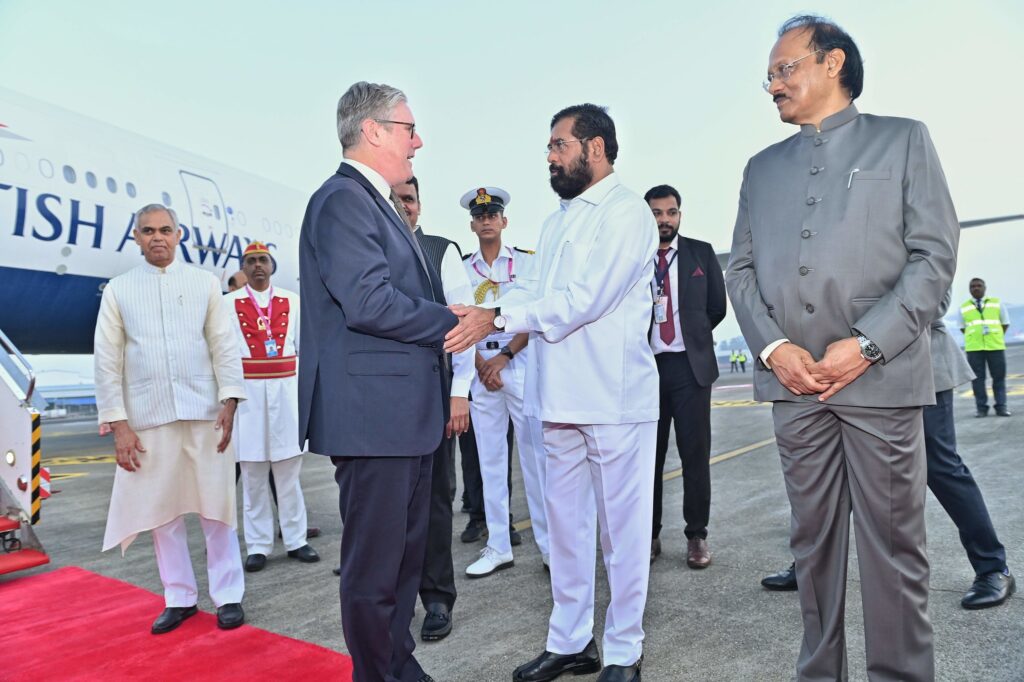Mumbai, India – The Prime Minister of the United Kingdom, The Rt. Hon. Sir Keir Starmer, arrived in Mumbai on a two-day official visit to India. Upon his arrival at the Mumbai airport, he was warmly received by Shri Acharya Devvrat, the Governor of Maharashtra and Gujarat.